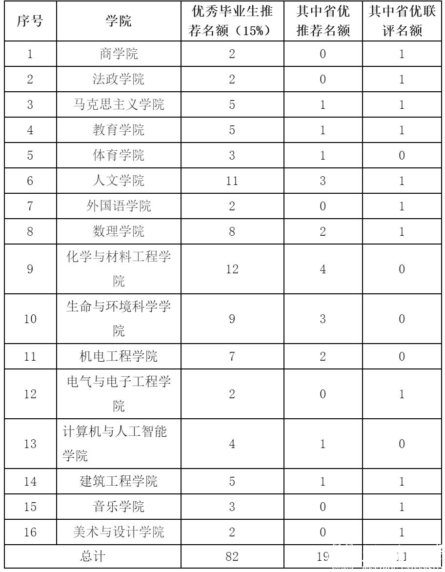 根据毕业生就业系统名单测算,拟评选27名研究生省优毕业生,其中19个指标以“推荐名额”按比例直接分配到公司,8个指标在11个公司的推荐人选中通过联评产生(经联评未被推荐为省优毕业生的3人为校优毕业生)。拟评选校优秀毕业生55人,具体指标分配见下表。