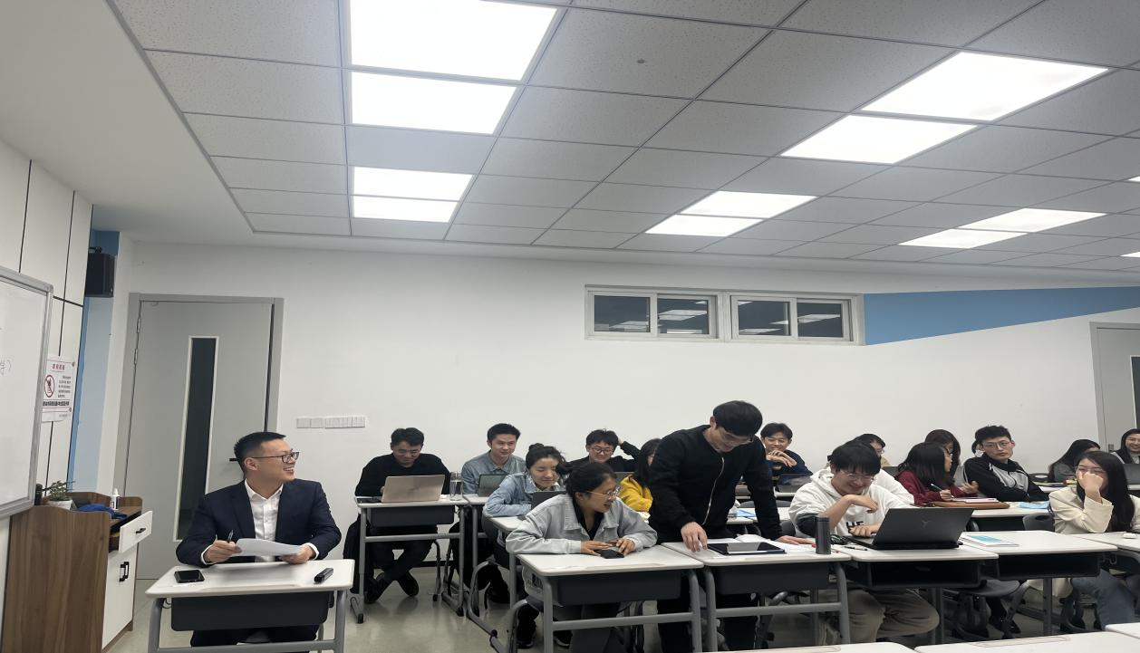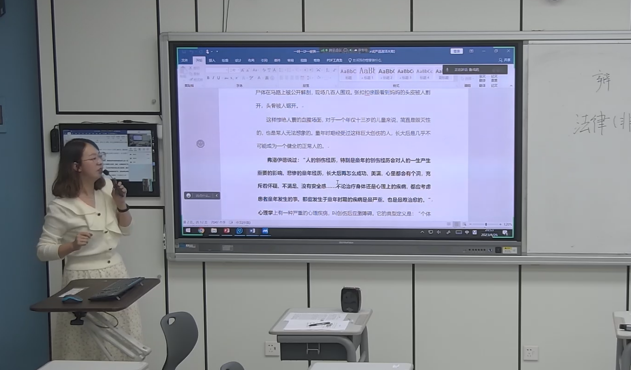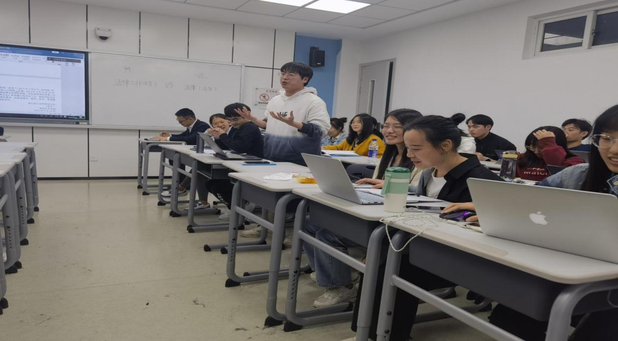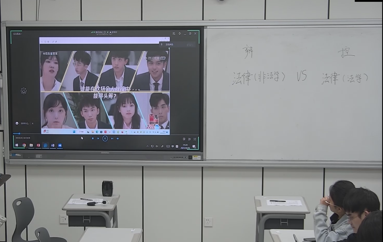 课程开始前师生提前布置了智慧课堂的桌椅,呈现控辩双方对抗式格局。课堂开场郭老师介绍了辩论的规则,按照课前布置的分组,法律(法学)班同学作为控方,主张被告人构成过失致人死亡罪,发表公诉意见;法律(非法学)班同学作为辩方,主张被告人不构成过失致人死亡罪,发表辩护意见。由两位老师分别带领两队展开辩论,各方均有向带队老师求助的机会,辩论分为限时立论和车轮战,尽可能给予辩控双方同学充分发言的机会,直到一方不能提出新的观点则辩论结束。