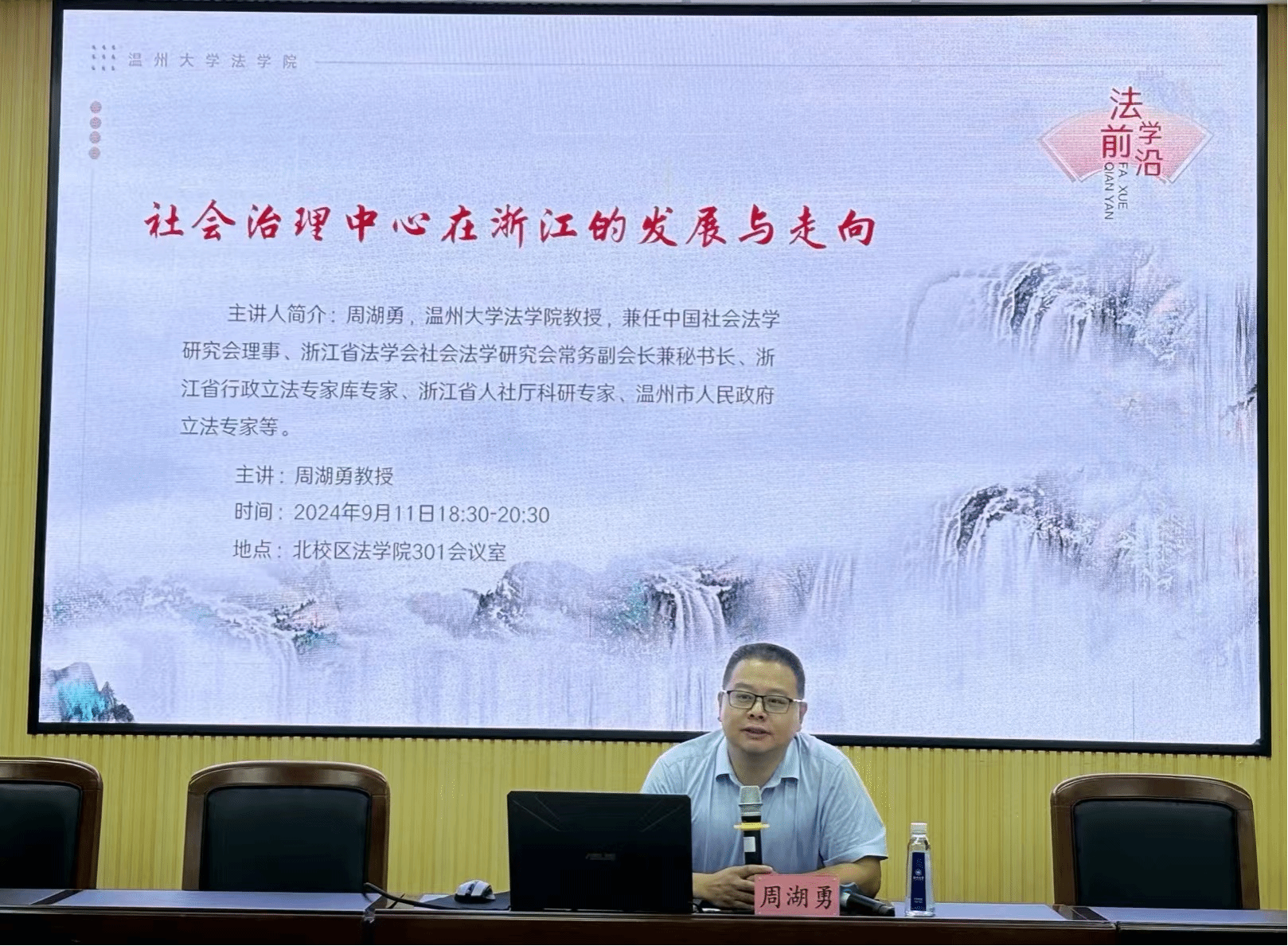 9月11日晚,由yl永利集团官网登录主办的第二期法学前沿讲座系列在301会议室开讲。公司周湖勇教授受邀作了《社会治理中心在浙江的发展与走向》讲座,公司师生六十余人参加了此次讲座的学习和讨论。
