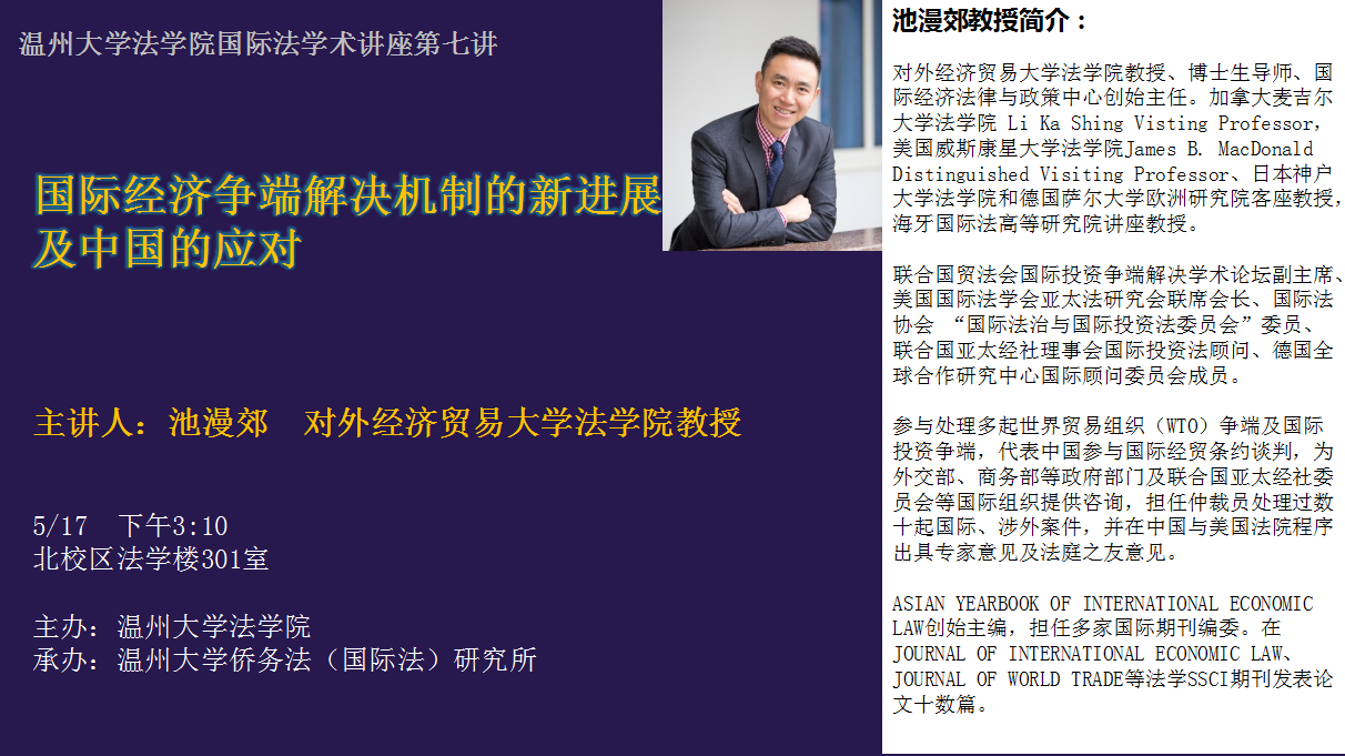 yl永利集团官网登录国际法学术讲座第七讲——《国际经济争端解决机制的新进展及中国的应对》