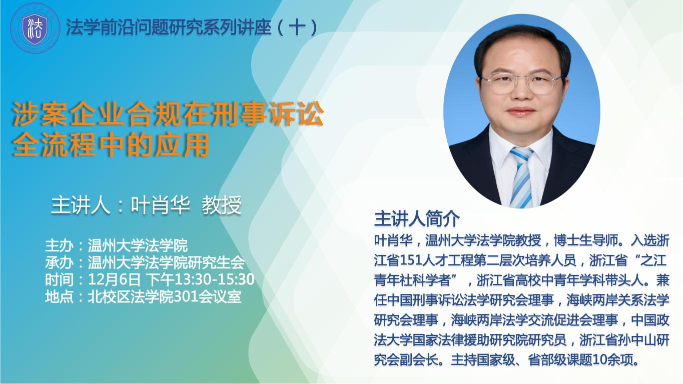 法学前沿问题研究系列讲座第十讲|《涉案企业合规在刑事诉讼全流程中的应用》
