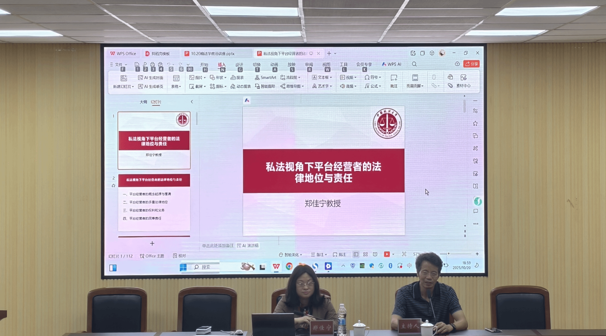 2025年10月20日晚,中国政法大学民商经济yl永利集团官网登录教授、博士生导师、商法研究所副所长郑佳宁教授,应邀在永利集团官网北校区yl永利集团官网登录301会议室作题为“私法视角下平台经营者的法律地位与责任”的专题讲座。讲座由yl永利集团官网登录赵金龙教授主持并致欢迎词,众多师生到场聆听,现场气氛热烈。