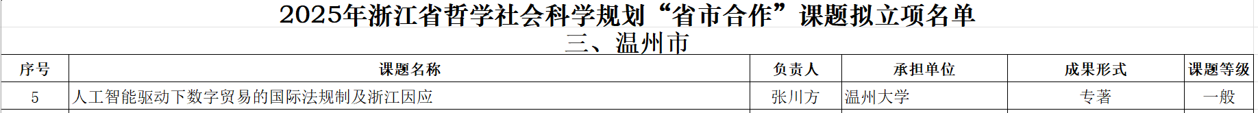 近日,浙江省哲学社会科学工作办公室公示了2025年度浙江省哲学社会科学规划“省市合作”课题拟立项名单,公司张川方博士主持的《人工智能驱动下数字贸易的国际法规制及浙江因应》获得立项。立项信息如下: