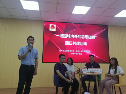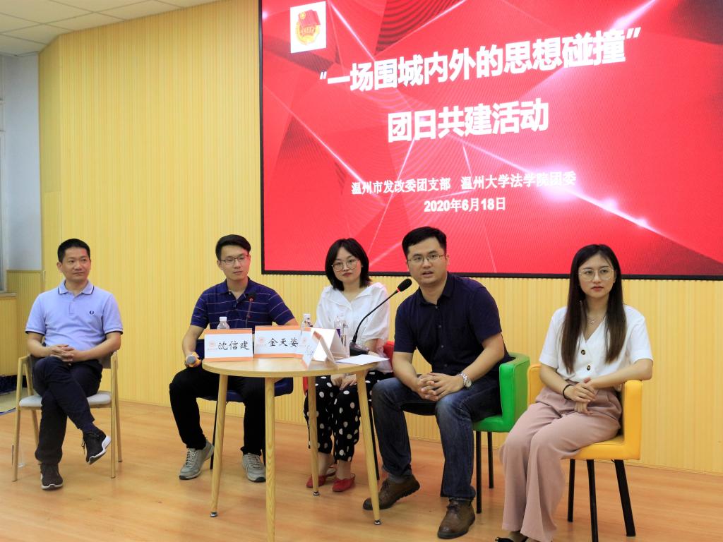 6月18晚,yl永利集团官网登录团委与温州市发改委团支部联合举办的“一场围城内外的思想碰撞——关于机关就业的话题”团日共建活动在法301举行。本次讲座由市发改委团支部书记张嘉倩和yl永利集团官网登录学工班主任林丽丽主持,金天姿、沈信建、虞臣肖和王琼四位发改青年干部主讲,市发改委团支部委员王俊组织工作,并特邀市发改委人事处(机关党委)处长汪振标永利集团官网学工部副部长吕乐参加次活动。