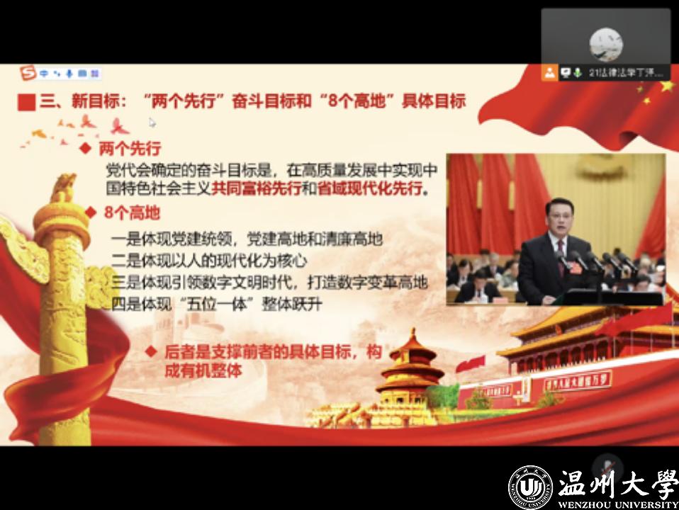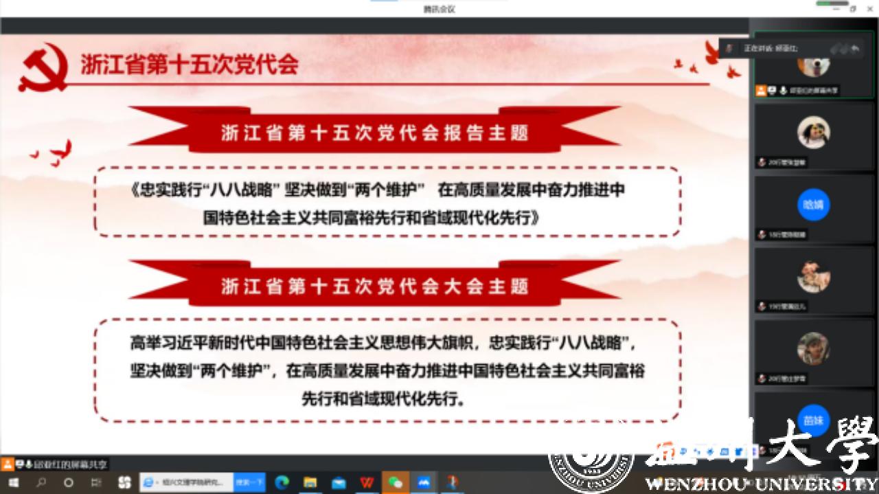 yl永利集团官网登录本科生第三党支部7月13日的会议中,蒋嘉怡同志主持开展了以“当先锋、争先行”为主题的线上党日活动,48名与会全体党员参与了主题学习活动,其中20级党员分享了自己的读书体会,18、19级的同学在主题党日活动后撰写了自己的心得体会。活动中,各位党员同志共同学习了袁家军同志代表中国共产党浙江省第十四届向大会作题为《忠实践行“八八战略”坚决做到“两个维护”在高质量发展中奋力推进中国特色社会主义共同富裕先行和省域现代化先行》的报告。报告总结了过去五年中国共产党的工作,坚决拥护“两个确立”,并对未来五年的工作的总体要求、在高质量发展中实现中国特色社会主义共同富裕先行和省域现代化先行的奋斗目标和“10个着力”的主要任务作出了初步构想。