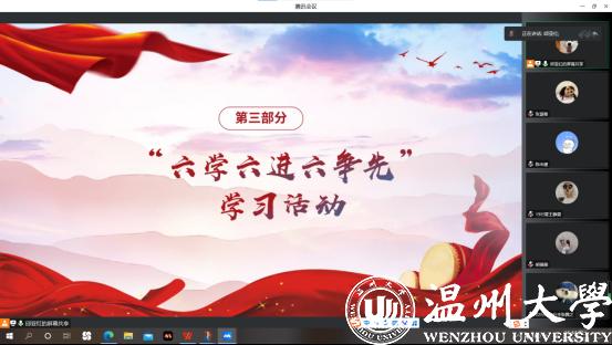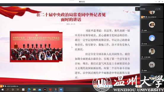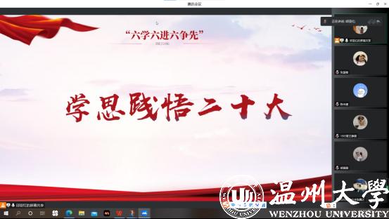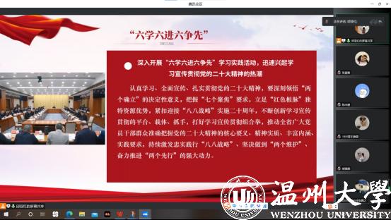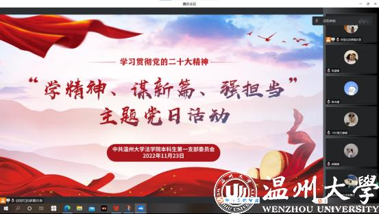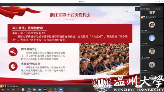 学党史,强信念,跟党走。为深入学习宣传贯彻党的二十大精神,深入开展“六学六进六争先”学习实践活动,更加坚定紧跟核心奋进新征程的政治自觉,努力在新的赶考之路上继续干在实处、走在前列、勇立潮头,yl永利集团官网登录本科生第一党支部于2022年11月23日下午开展线上“学精神、谋新篇、强担当”主题党日活动。本次会议应到会党员39名,实到会党员39名。本次活动本次活动共分为四个部分:学习贯彻党的二十大精神、浙江省第十五次党代会精神学习、“六学六进六争先”学习、学思践悟二十大,由邱亚红同志主持,支部全体党员和预备党员参与了此次活动。