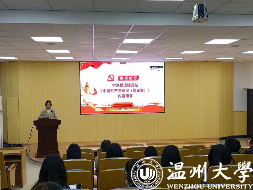 第一个议程,党员学习《中国共产党章程(修正案)》。在正式学习之前,支部全体党员重温入党誓词,全体起立,郑重宣誓。邱亚红同志带领党员集中学习党章知识。中国共产党是领导我们事业的领导核心,党的领导是实现中华民族伟大复兴的根本保证,通过学习,党员同志必将党章内容内化于心,外化于行。第二个议程,党章知识测试环节。在对《中国共产党章程(修正案)》进行学习之后,以知识问答的形式对支部党员同志进行测试,从“请你谈谈党的二十大为什么要修改党章”到“党章修改对我们员工党员的行为规范有哪些方面的影响”共十五题,党员同志们认真思考后积极作答,在学习中不断进步。