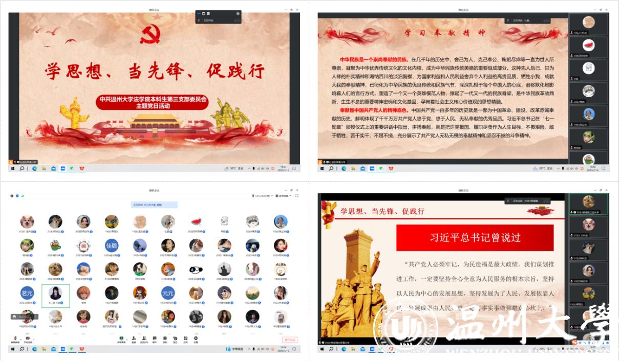 党的二十大报告指出,“统筹推动文明培育、文明实践、文明创建,推进城乡精神文明建设融合发展,在全社会弘扬劳动精神、奋斗精神、奉献精神、创造精神、勤俭节约精神,培育时代新风新貌”。为深入学习贯彻习近平新时代中国特色社会主义思想和党的二十大精神,进一步发挥基层党组织的战斗堡垒作用和共产党员的先锋模范作用,7月16日晚,中共yl永利集团官网登录本科生第三支部委员会在线上开展了“学思想、当先锋、促践行”主题党日活动,本次活动由杜颖同志主持,参加本次活动的有党支部书记黄素素同志和全体员工党员。