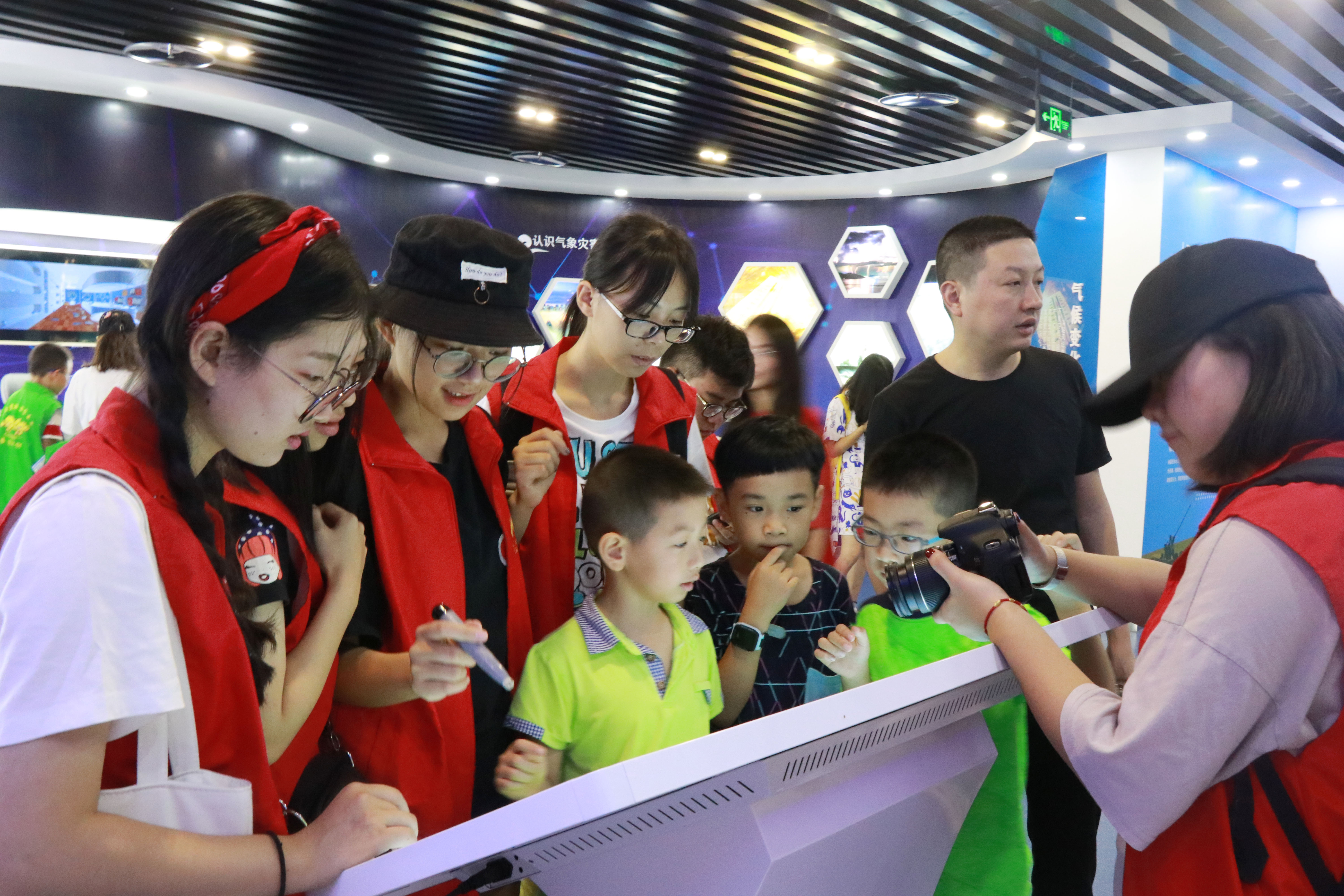 “台风来临时,小朋友们要留在室内,尽量不要外出。让爸爸妈妈关好窗户,检查阳台上有没有会被风刮落的东西,有的话一定要移除……”听着讲解员的防台注意事项,小朋友们纷纷点点头,并说一定会告诉爸爸妈妈,防御即将到来的“安比”台风。接着,小朋友们来到了“气象灾害预警”处,通过翻转方块,不仅让他们知道了气象灾害预警信号的图标,还让他们知道了不同颜色的气象灾害预警信号所表示的含义,加深了他们对气象灾害预警的理解。一旁的小朋友则在玩游戏答题的过程中,进一步加深了对气象灾害预警的记忆。科技与VR的结合,也同样引起了小朋友们的好奇心。他们戴上VR眼镜,坐在椅子上,驾驶着“宇宙飞船”,来到了恐龙世界。另一边,好几个小朋友排着队,纷纷体验了一把“虚拟气象主持人”,做了一回小小“天气预报员”。