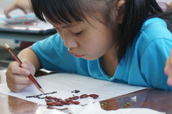 知识普及过后,志愿者细心地为每一小组分好材料,终于可以开始动手作画了! 孩子们先选出一句自己的喜欢的标语,一笔一划认真地写在纸上,然后从一堆豆子和大米中精心跳出几颗,顺着自己写的笔画黏上去。这看似简单的程序实际操作起来还真不简单,刚黏好的豆子一下子又掉在了地上,一颗一颗大米黏上去又要花费好多时间,孩子们都"各显神通",一双双巧手把宣传标语用五谷呈现在了纸上。