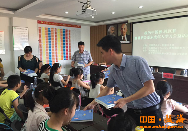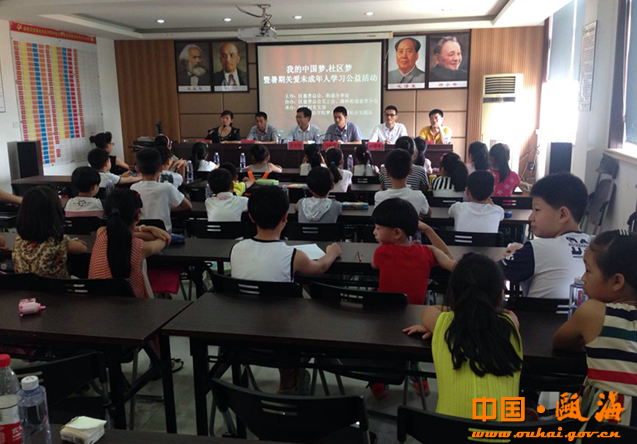 为丰富青少年暑期生活,让孩子们暑假中不仅只有学习,还有愉快的精神文化生活,过一个不一样的暑假,区下派指导员吴海萍主动沟通联系区慈善总会及义工分会,联合潘桥街道、温大政yl永利集团官网登录梦夕阳暑期社会实践队,在横仙河社区河西村民中心开展"我的中国梦.社区梦"暨暑期关爱未成年人学习公益活动。