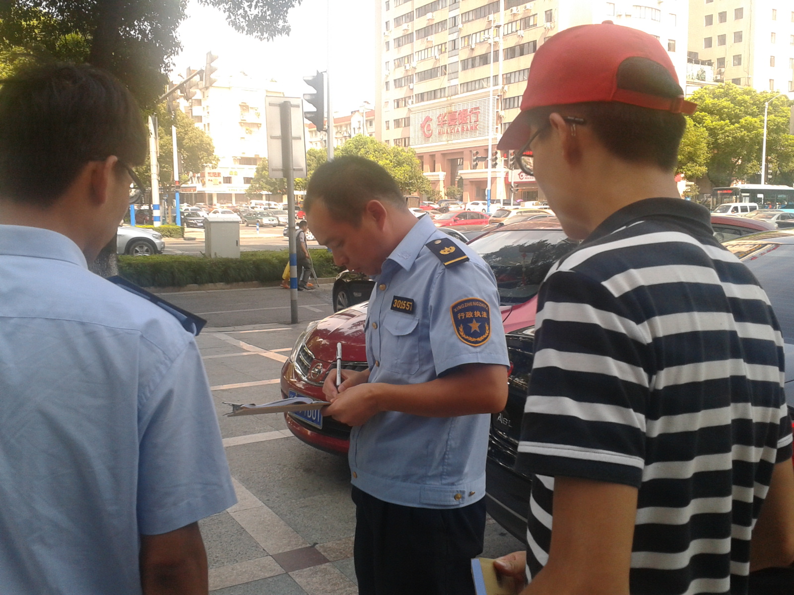 上午八点半,中门队员赶到了分队,随后与执法队员一道上街调查违章停车现象。对个别违章停车的车主开具罚单,并做好拍照取证工作。在执法过程中,有车主看见执法队员在开具罚单,便直奔过来解释求情,希望执法队员手下留情。但是规定始终是规定,虽然不排除个别车主真的是暂时下车拿点东西,但是没有规矩不成方圆。综合考虑两种情况,执法队员对前来求情的车主给以"临时停车"的处罚。下午,执法队员街道群众投诉,"大港会"二楼有不知名的水滴落到人行道上,怀疑是施工造成的。随后,队员们与执法队员一同赶往现场。在与餐厅负责人了解情况之后,发现事实是餐厅给二楼空调外机降温造成的,不是怀疑的施工。在对负责人进行协商之后,执法队员收队了。
