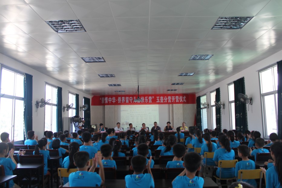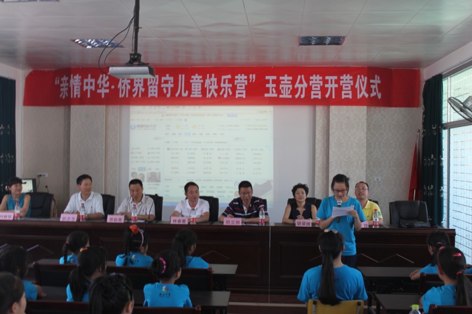 2013年7月8日上午9:30,温州市侨界留守儿童快乐营玉壶分营开营仪式于玉壶镇中心小学多媒体教室隆重举行。出席本次开营仪式的领导有:温州市侨联秘书长林春雷,温州市侨联维权部部长苏彩亮,文成县侨联副主席胡翠娥,文成县外联办主任胡立帅,玉壶镇小董事长周锋等;"亲情中华"温州市侨界留守儿童快乐营玉壶分营实践队全体队员,玉壶镇小百余名营员参加开营仪式;玉壶镇小大队辅导员刘丽华主持开营仪式。