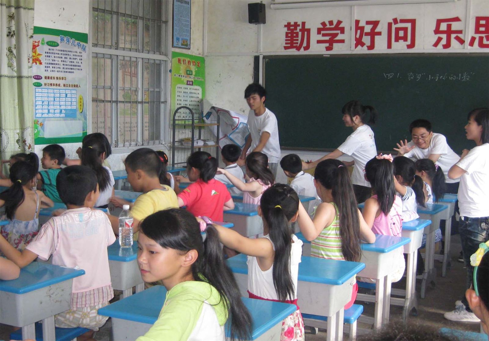 仪式结束后,我们发放了书包,并进行了必要的班会。三个班级的班主任开始了玉壶分营真正的第一节课。对本次活动进行介绍后,开始同学们之间的互相介绍,活泼质朴的他们,在这堂班会课上让我们对于他们个人和家庭做了简单的了解,当然,我们还会进行家访等一系列活动,以此来更加了解他们。下午,我们针对年级分别开展了弟子规和普通话教学,整个过程,同学们踊跃参与,我们大汗淋漓,但我们无怨无悔。最后我们以体育课和舞蹈课结束今天。操场上互动游戏奔跑的我们,是团结一心的象征。