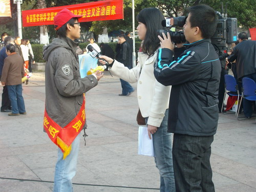 12月4日早上六点多,志愿者们就早早地起程赶往松台广场。在咨询现场,志愿者们非常主动地融入到普法宣传的队伍当中去,发起了传单,变成一个个法律宣传员。他们亲切地笑着,耐心地解答群众提出的社会热点、难点等相关法律知识问题。广场上,随处可见的我们志愿者的身影,成了冬日里一道亮丽的风景线。