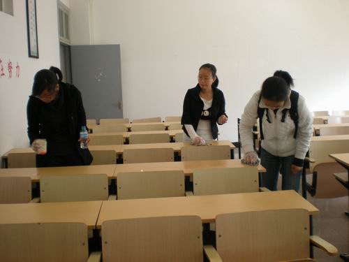 首先,所有人员在2-111教室集合,由校文明督察队员为志愿者们按步骤讲解了如何使用橡胶水清洗桌面,同时也提醒志愿者注意自身安全,避免身体直接触碰橡胶水造成伤害。随后,在青年志愿者服务部人员向志愿者分发了手套、抹布、橡胶水等物品进入到各个教室内进行清理。在浓烈刺鼻的气味中,志愿者们没有抱怨有条不紊地擦拭着桌面,每一张桌子在经受一番"洗礼"之后都焕然一新,在阳光的照耀下泛出明亮的光彩。