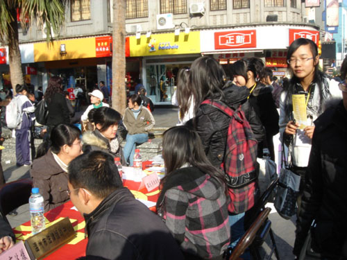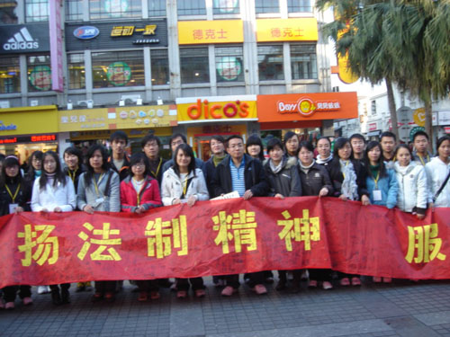 12月4日是普法宣传日,为了让市民更加地了解和支持中国的法制事业,永利集团官网法律援助中心的成员们在12月6日12点集合并直奔目的地.最后决定将本次活动的地点放在五马街的小广场上.本次活动分成三部分:一.邀请温州市法律援助中心的专家以及温大法政公司的大三员工叶雅青和谢思思给予免费的法律咨询.二.设了一条上面印有"弘扬法律精神,服务科学发展"的横幅,并鼓励市民们在上面签名.三.制作法治留言板,让人们写下自己对法治社会的看法.整个下午,来签名的人络绎不绝.满满一横幅的名字足以证明法治精神的深入人心.