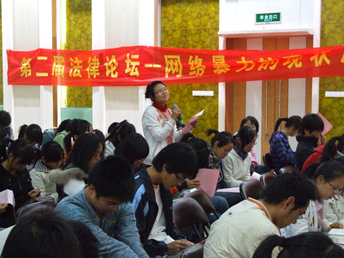 活动首先邀请嘉宾入席,台下顿时掌声热烈。接着,主持人就论坛上的热点问题与嘉宾进行了问答,在座人员一同观看了"很黄很暴力"和华南虎两段事件视频,嘉宾对事件做了简要的分析。随后的有奖问答题目环节将活动带入了高潮,同学们对嘉宾的问题进行了踊跃的回答问题并阐述了自己的观点。通过嘉宾的分析,我们也对网络暴力有了更深的了解。活动的最后环节是同学提问,嘉宾一一解答了同学们心中的疑惑,使同学们获得了更多的专业知识。活动以嘉宾赠言的形式画上了一个圆满的句号。