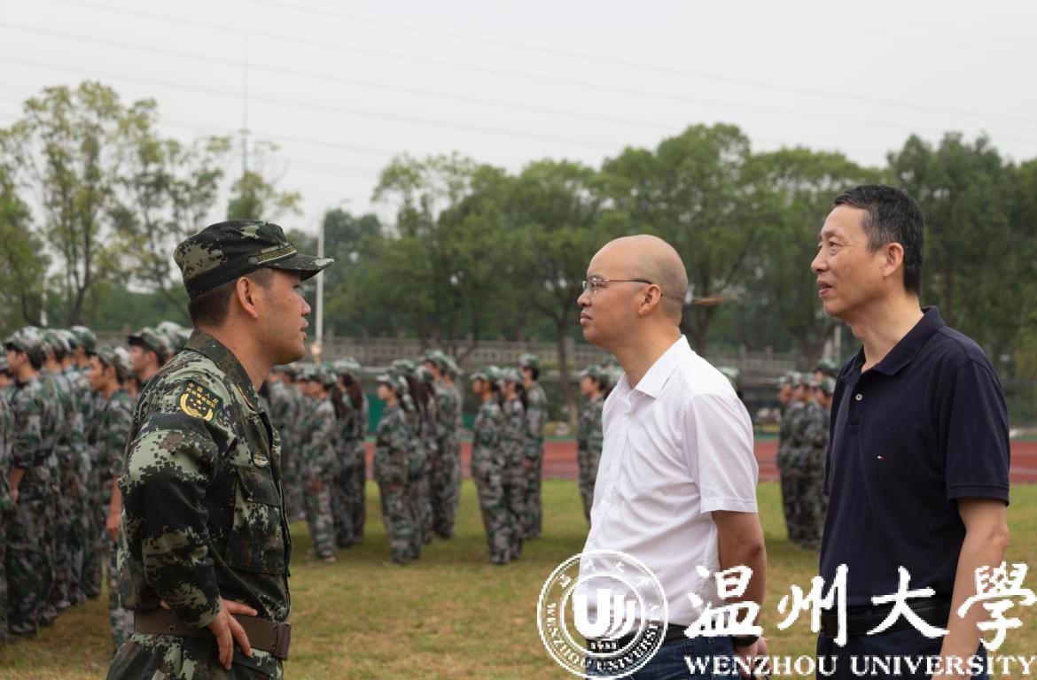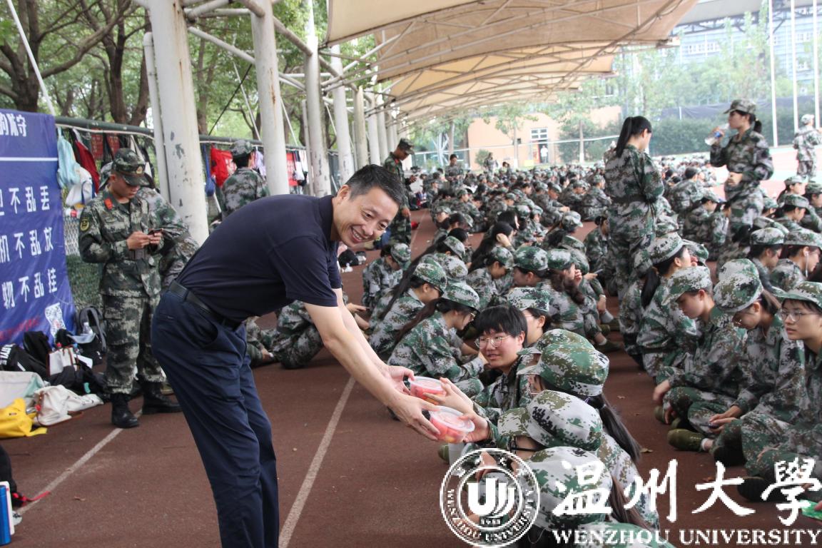 10月12日上午,经理王宗正、党委书记林钦在北校区运动场慰问承训教官与2019级全体军训新生。