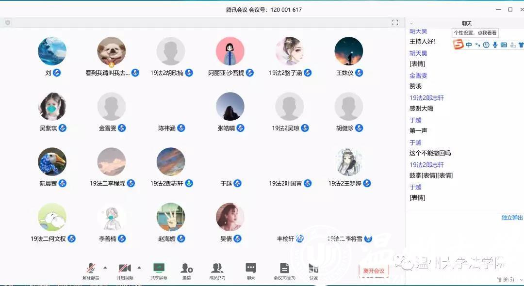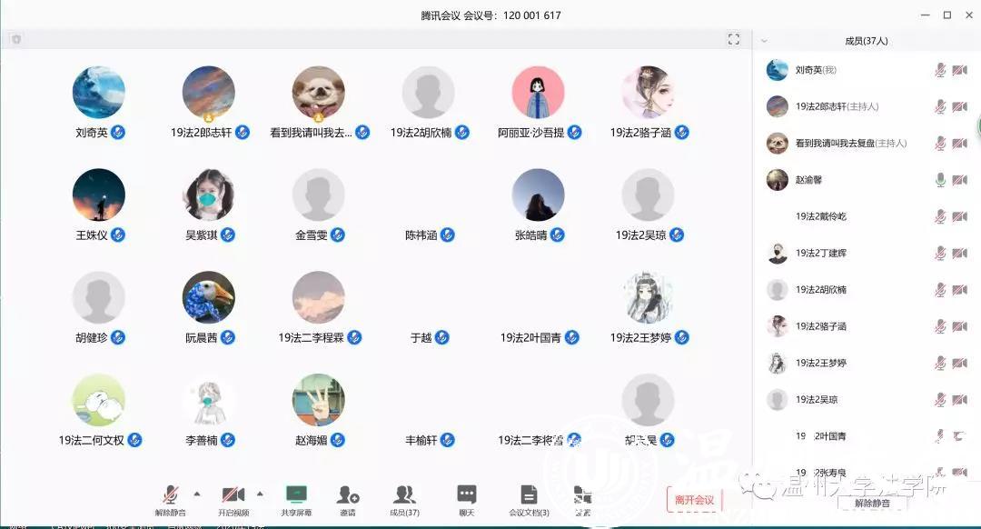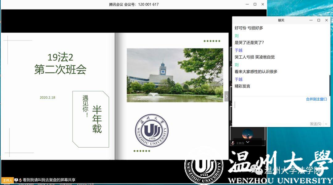 疫情就是命令,防控就是责任。根据省教育厅和公司有关工作部署,公司辅导员、班主任主动深入员工,切实做好公司员工疫情防控有关工作。近日,公司开展主题为“同心战'疫',温大学子在行动”的网络班会。其中,19法学2班开展线上主题班会,班主任刘奇英老师组织班级同学围绕疫情展开讨论、分享感悟,表达了对这场战疫终将胜利的信心和美好祝愿。