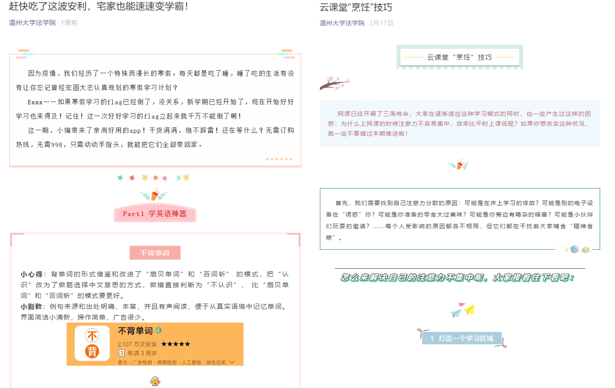 “晒”书桌笔记,推送宅家学习“大曝光”系列,展示“最美学习笔记”、“最美学习书桌”,让员工感兴趣为起点,以“有用+有趣”作为员工产生兴趣的切入点,引导员工以健康向上的面貌投入线上学习。制作“学霸来了”网络学风建设专栏,“晒”出优秀学子网课学习心得,引导全体员工养成自律习惯,营造“比学赶帮超”的良好氛围。
