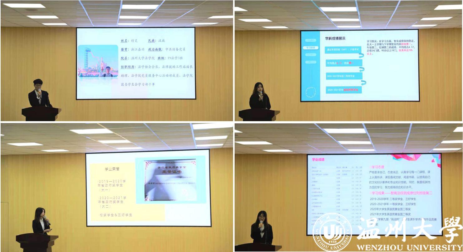 展示过程中,评委们分别从学习风气、素质拓展、纪律行为、展示水平等方面进行综合打分。最终,19法学4班拟推荐为校“优良学风班”,20法学1班、19行管班、20法学2班、19法学1班拟推荐为院“特色班级”,20行管班、20法学4班、19法学3班、20法学3班拟推荐为院“最具潜力班”。