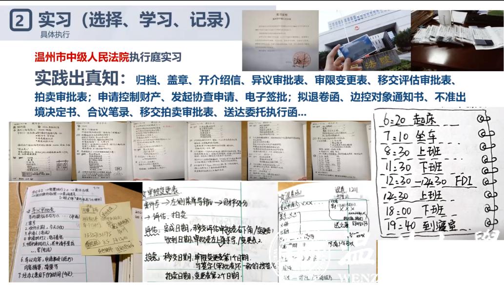 19法4班徐静仪同学结合自己的亲身经历,从一位并不喜欢法学的“被调剂”同学到法学学习的“标兵”,以心态转变带动行动实施,从学习、实习和竞赛三个方面分享了奋斗历程。她说:“我对每一秒都有意义”的理解是,你遇见的每一件事,都有其存在的意义。要脚踏实地去做好每一件事,无论是学习又或是娱乐,他们都是你人生独有的一部分。” 她认为实习生活对与自身发展具有关键作用,她分享去年暑假在温州市中级人民法院执行庭实习经历,从归档、盖章、开介绍信,一审批表、审限变更表、移交评估审批表到发起协查、申请电子签批等等的学习。