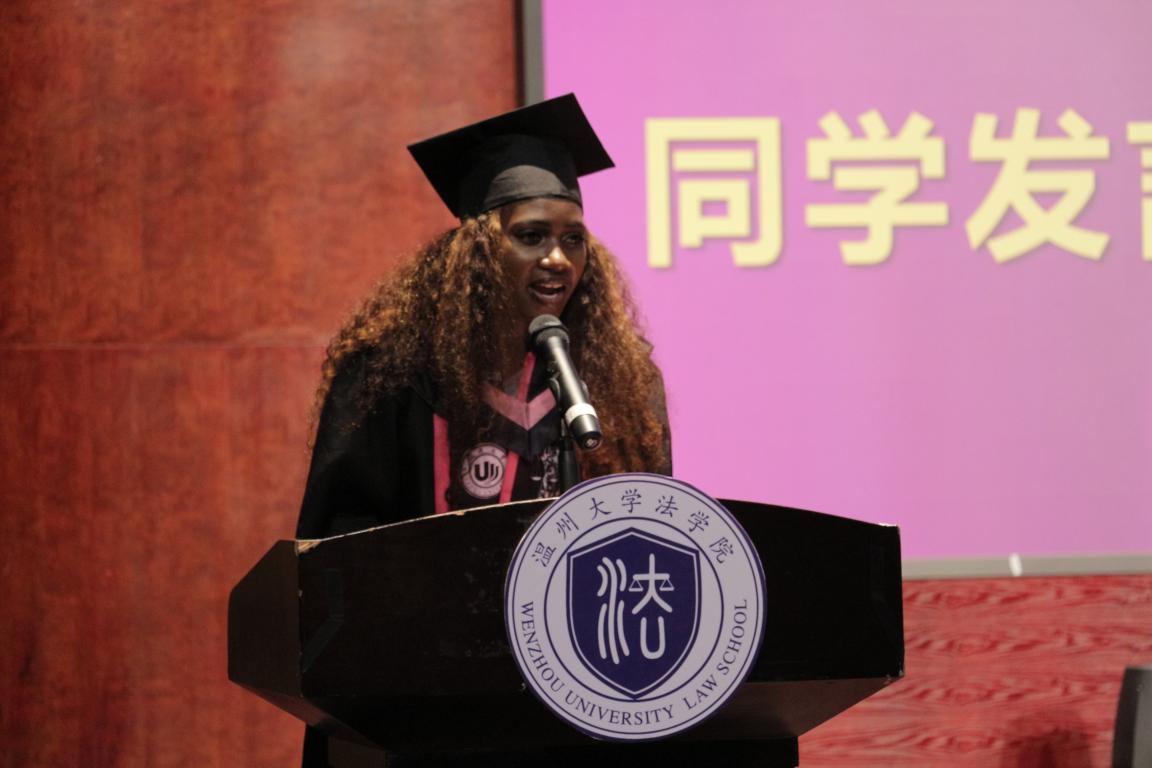 “那时的我们心怀对法律的敬畏、对正义的执着、对法学的热爱,从五湖四海而来,而如今,离别的钟声却已敲响。”国家奖学金获得者、浙江省优秀毕业生王亚萍作为研究生毕业生代表发言,她分享了自己三载春秋寒暑的感悟,祝福所有毕业生他日凌云,万事胜意。所有的经历都将成为我们宝贵的财富。“就让我们兴致盎然的与世界交手,满怀期待的对未来作出判决,跃入人海,光明灿烂。”