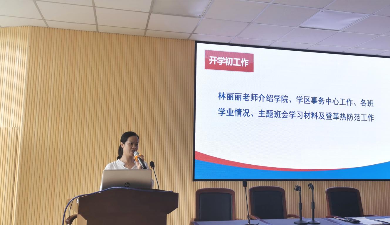 林丽丽介绍了员工科辅导员分工与职责,就开学初公司、学区事务中心工作、各班学习情况、主题班会学习材料及登革热防范工作做了详细安排。