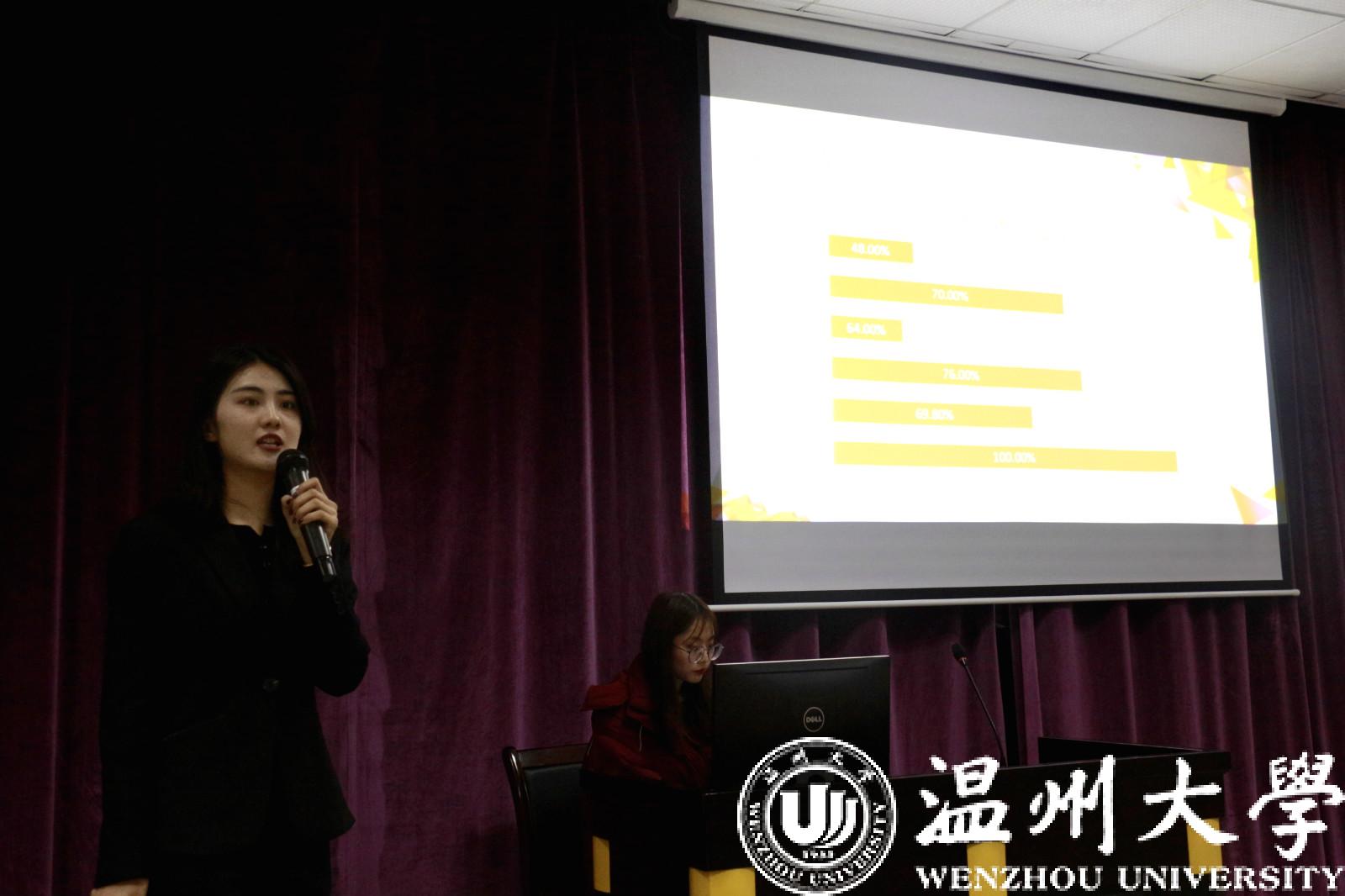 特色班级评选中,参加本次评选的10个班级分别从班级特色、学风建设、班级荣誉、团日活动等方面介绍特色班级建设情况。各班用英语四六级通过率、计算机一二级通过率、奖学金获得情况、志愿者及义工小时时长等数据描绘出公司学子勤学日新的画面。各班通过情景剧、合唱、表演武术、一张张照片、一段段视频、一张张奖状展现了他们青春的活力,对未来的期望。站在台上的各班代表身着正装,斗志昂扬,自豪地展示各自班级青春奋斗风采。