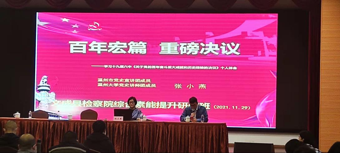 yl永利集团官网登录针对文成县人民检察院的需求精心准备培训内容,多角度入手展开专题教学。马克思主义公司张小燕教授围绕百年党史,对三大决议作了高度抽象的概括和精彩的解读,呼吁广大青年敢于寻梦、勤于追梦、善于圆梦;yl永利集团官网登录付翠莲教授从概念介绍、重要意义和实施措施三方面分析了基层社会稳定风险评估及其中的法律分析问题;谢丽珍副教授以企业合规不起诉制度为切入,提出如何对检察职能进行延伸和突破的问题,通过引入刑事激励等概念加强对民营企业的保护;陈以拓博士由浅入深,既有证据审查、质证发问等的实践技巧,又有证据证明力的理论高度,从事实性控制、矛盾事实与差异事实三个角度重点分析了庭审发问的原理与方法;范兴科博士对数字化改革的国家政策、工作汇报和温州典型案例进行分析,强调要以问题为导向,准确把握数字化改革的内涵要求、重点任务等,从而推进数字化改革的发展;任江副教授将民法典婚姻家庭编与继承编重点制度与检察院职能相结合,从解释论的视角分析了意定监护监督机制、法定居住权、隐瞒重大疾病婚姻可撤销等问题;周湖勇教授以《未成年人保护法》修订为主线,阐述了修订的基本思路、主要情况、创新亮点等,重点分析了与未成年人检察工作的关联性,提出要以最有利于未成年人保护和国家责任为原则,给予未成年人充分的保护。