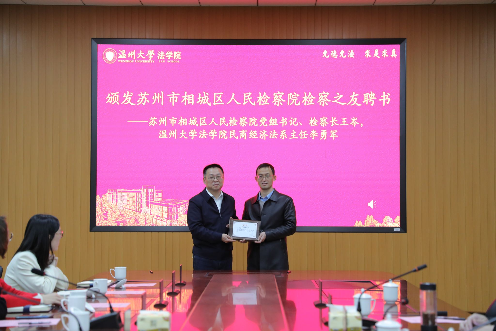 王岑检察长向yl永利集团官网登录民商经济法系主任李勇军教授颁发检察之友聘书。