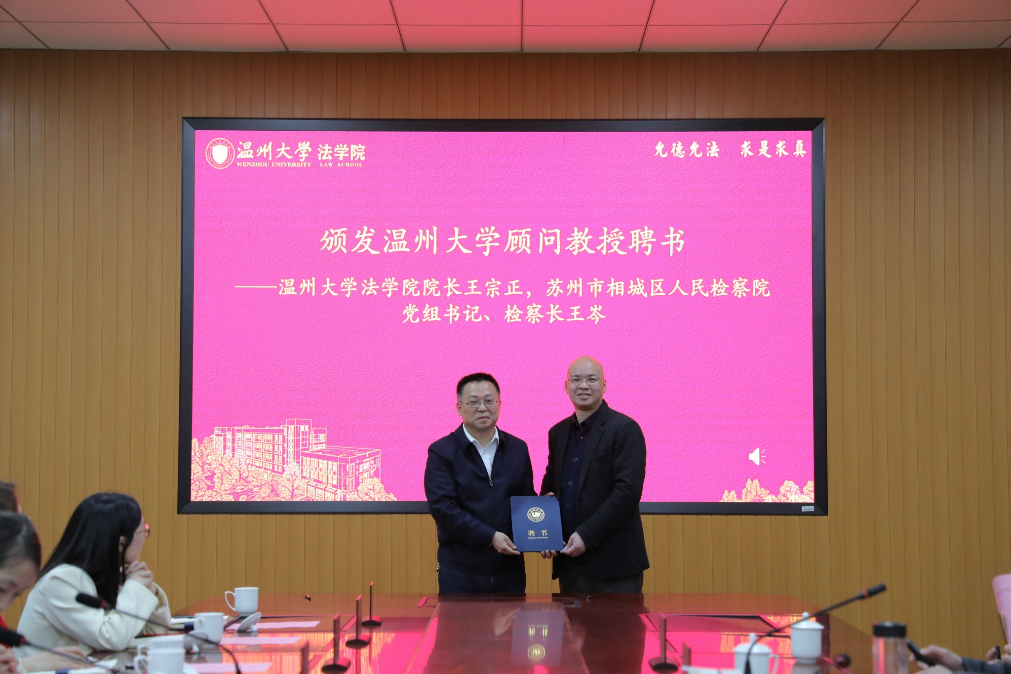 王宗正经理向王岑检察长颁发顾问教授聘书。