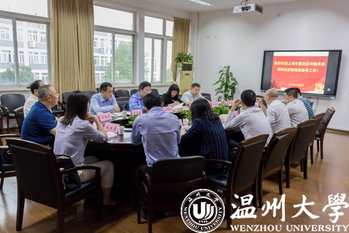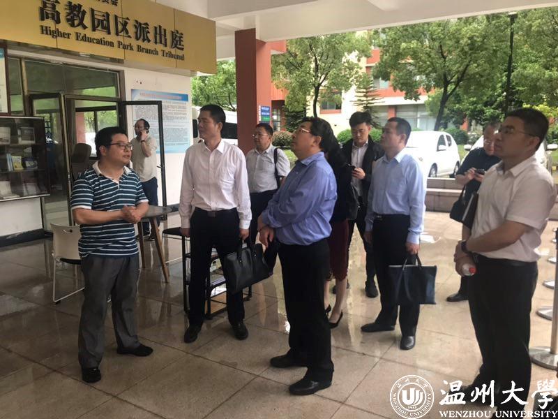 由上海市嘉定区人社局副局长戴伟国带队区劳动人事争议仲裁院、区劳动监察大队、调解仲裁管理科、劳动保障监察管理科、劳动关系科等部门组成的调研组一行8人冒着大雨参观了高教园区派出庭和职工服务中心高教园区分中心。市人社局副局长李道钮、市仲裁院副经理柳景珏以及瓯海区人社局党组成员、社保中心主任周肖瑜、区仲裁院经理陈光海陪同考察。