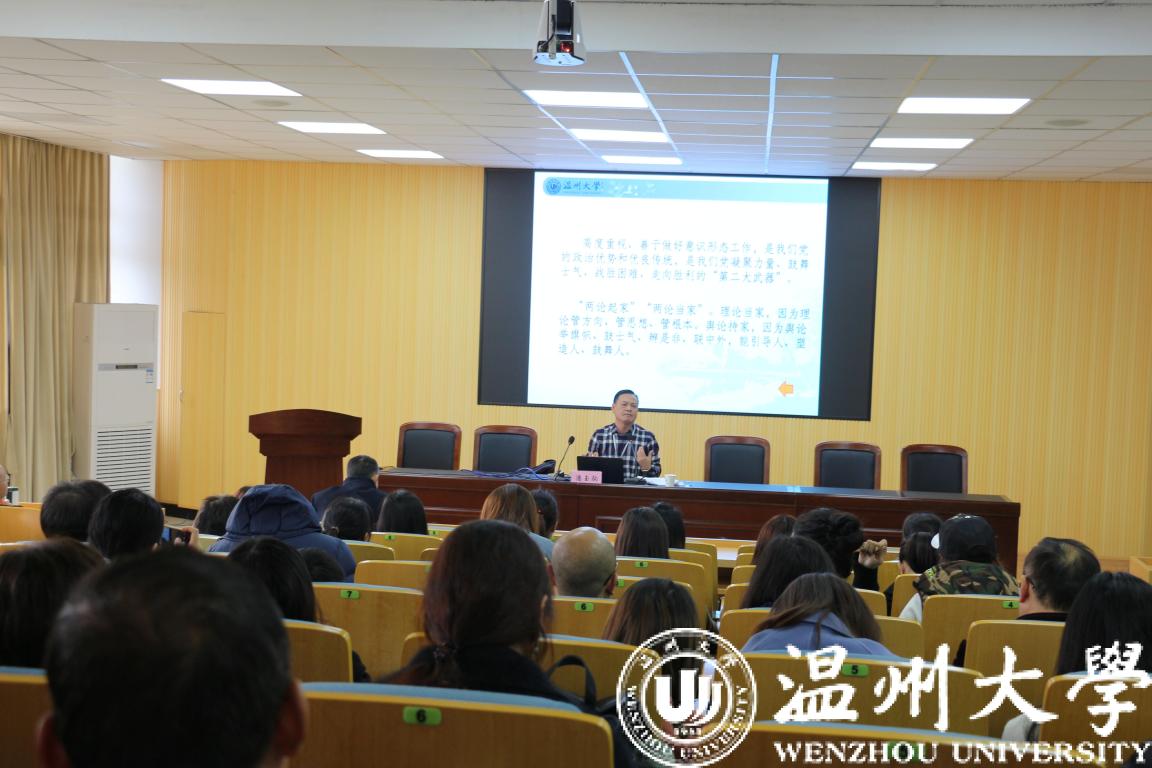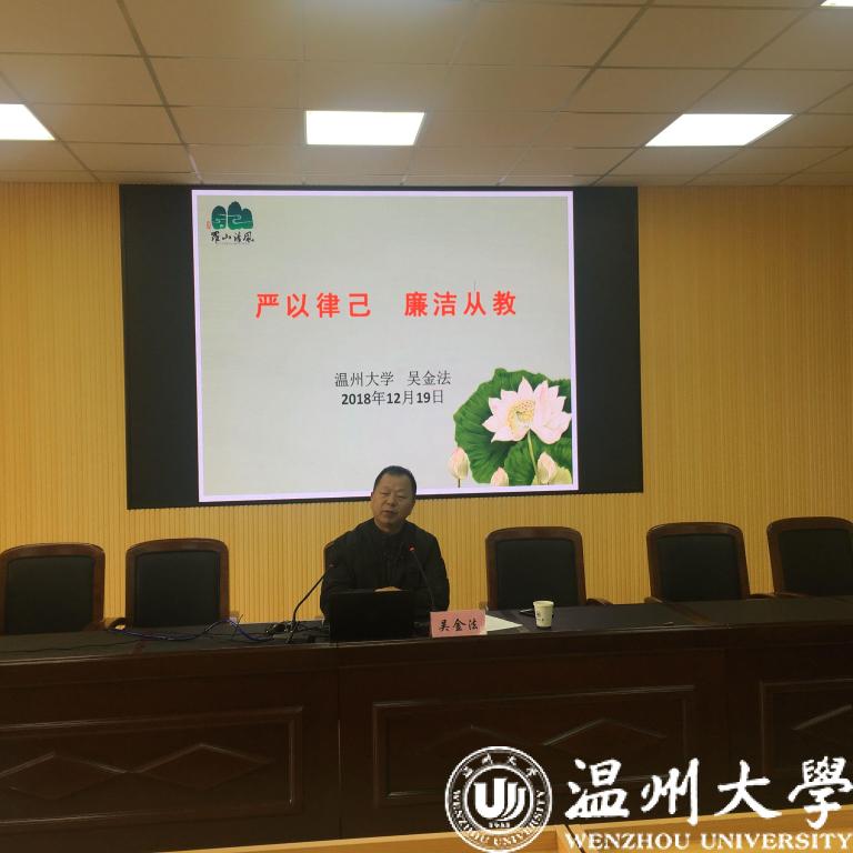 2018年12月19日下午,公司在北校区法政楼301报告厅召开了全院教职工大会和专题政治学习会。公司党委委员、纪委书记吴金法做《严以律己,廉洁从教》专题讲座,公司党委委员、宣传部长潘玉驹做《牢牢把握意识形态工作领导权主动权》专题讲座。本次讲座由法政公司书记林钦主持,保卫处、音乐公司与法政公司全体教职工及公司研究生党员、预备党员及入党积极分子参加学习。