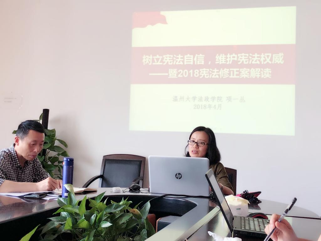 缪心毫副经理做了教学工作布置,着重强调毕业论文答辩工作安排和中期教学检查;法学系项一丛老师作了《树立宪法自信,维护宪法权威》的讲座,对2018宪法修正案做深入浅出的解读。