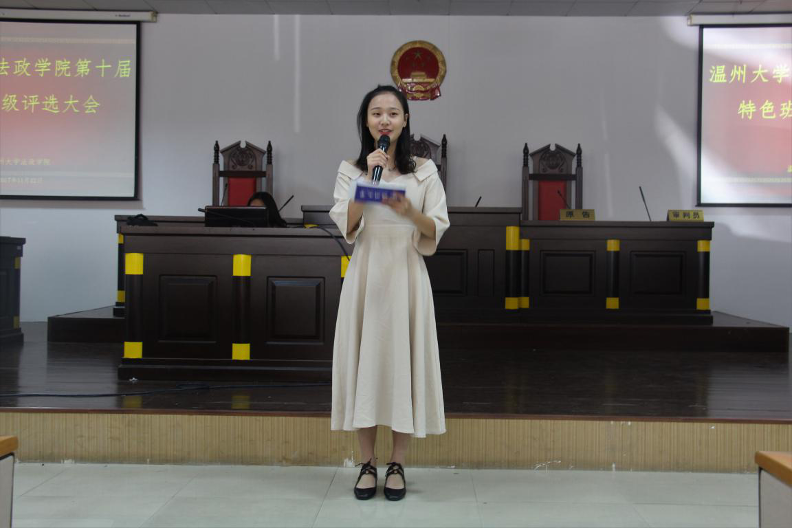 大会伊始,12个候选班级的宣讲人分别上台介绍,他们以图文并茂的PPT作为载体,伴随优美动听的背景音乐,结合班级特色,从学风建设、素质拓展、党团活动、创新科技等方面将班级概况立体式呈现在老师和同学们的眼前,展现了各自班级的优秀风貌和同学们的青春风采。12位宣讲人宣讲完毕后,在等待评选结果期间,一段盛满班主任老师祝福和展现班级风采的短片再次点燃会场的气氛,各班班主任对本班级参选本次评选给予充分的鼓励支持,并对各班级的日常活动、班级建设及班级亮点特色进行了简明介绍,老师们真心的赞扬给所有同学带来了继续前进的无限动力。五分钟后,严玲红书记宣布了评选结果——15法四、15政本、15法三、15法一、15法二、16法一和 16行管获得了第十届法政公司特色班级的荣誉称号,其余各班级获得优秀奖。宣布过后,严玲红书记对此次评选大会进行了总结发言:首先,对所有参加活动的各个班级和负责筹备工作的部门表示感谢。接着,指出了法政公司各班目前存在的不足并提出建议;最后,对法政公司提出了更高的要求,深情地表达了对法政学子的殷切希望。