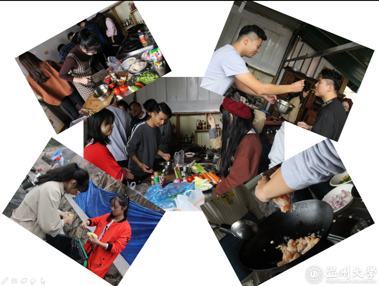 到达目的地后,同学们稍作休整,按照预先安排的分组开始了第一个素质拓展项目:呼吸大作战;这个项目要求同学们共同配合用管子搭成通道,然后共同从吹气口吹气来使出气口的气球爆炸;这个项目不仅考验了同学们的肺活量,也考验了同学们的动手能力和协作配合的默契度。第二个项目是"神笔马良",要求每组16名成员围成一个圈,共同拉着十六跟线控制一只笔,由十几位成员共同写下一个字,任务才算完成,这充分锻炼了大家的团队配合能力和凝聚力。两个项目结束以后,团学成员抽取了各组的食材去炊事处一起动手做饭,"黑椒牛柳"、"番茄炒蛋"、"蛋炒饭"、"可乐鸡翅"等等。大家定好菜谱后,都有条不紊地忙活了起来。法政团学藏龙卧虎,许多同学厨艺精湛,各显身手,最后大家都吃上了自己努力的成果,桌上的食物一扫而光。最值得欣慰的是,每一组成员完成菜品以后都会和其他组同学们一起分享自己的美食成果,大家在品尝美食的同时,也互相之间增进了友谊和凝聚力。