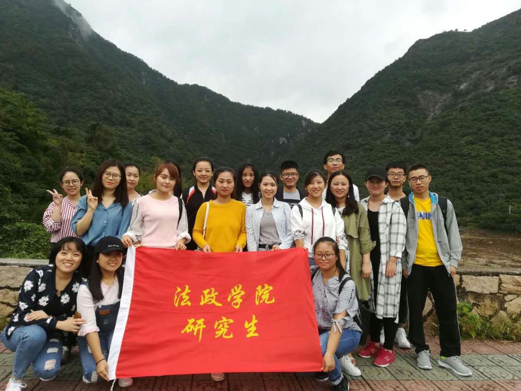 从山脚下开始攀登,道路微陡,难度稍加,但同学们仍然兴致盎然,欢声笑语。期间虽有惫倦,但都能一鼓作气,互相帮助以抵达山腰。这不仅体现出当代老员工百折不屈的拼搏精神,也能反映出法政研究生们敢于吃苦,勇于奋斗的良好气质。此时,细雨转大,行程还远,但同学们未言放弃,坚定目标,在雨中继续前行。大家这种风雨无阻,敢于探索的品格正是研究生的学习生活中必不可少的宝贵要求。随着时间推移,在互相鼓励之间,我们一行终于到达了此行的最后目的地——龙脊。在此眺望,俯仰之间,风景皆收于眼底。苍山翠林,烟雨朦胧,小河潺潺,蜿蜒流转。同学们流连忘返,用手机记录了这惊艳的时刻。感叹唯有坚持到底,才可领略无限风光。