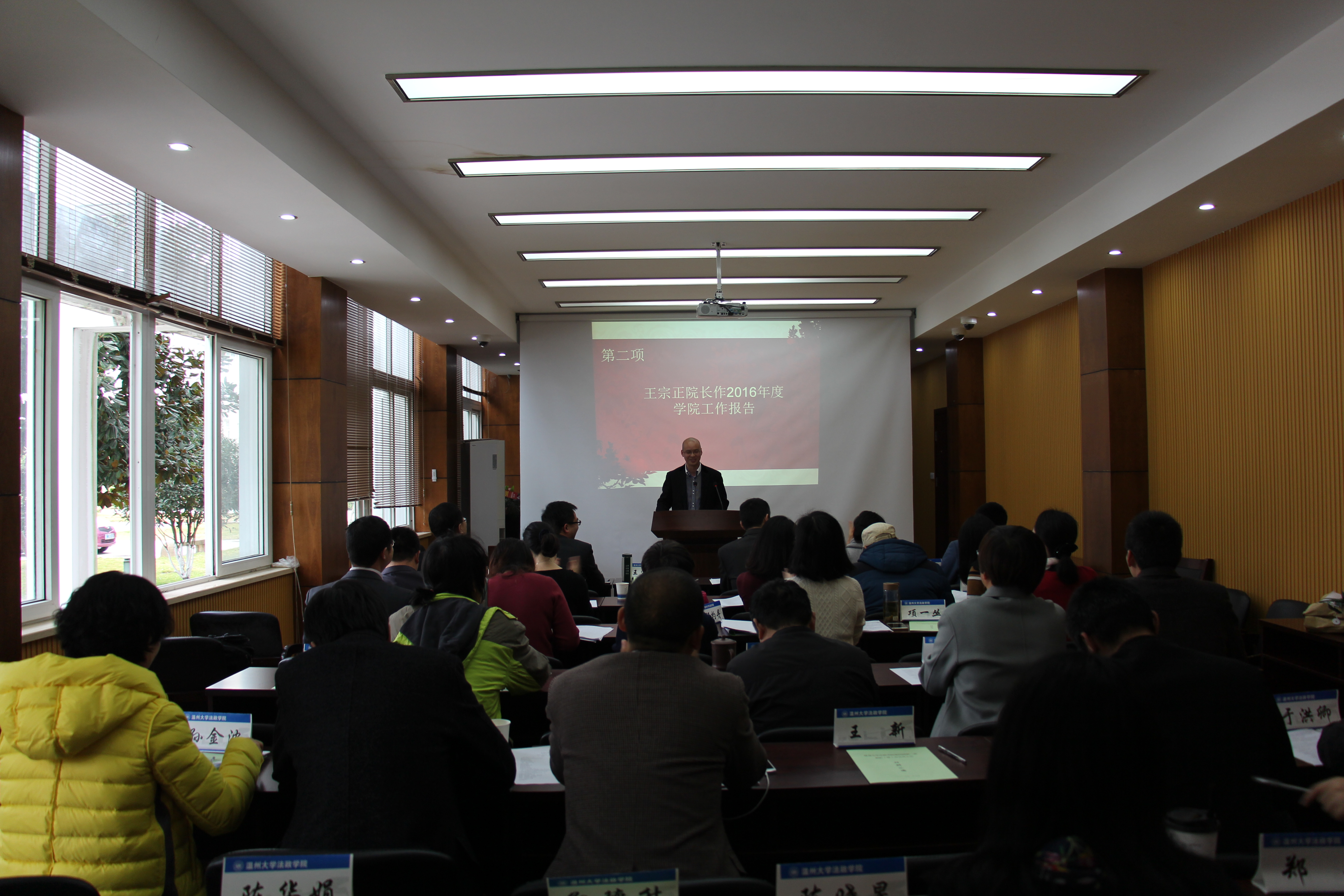 首先,经理王宗正做2016年经理工作报告,报告指出2016年是"十三五"开局之年,在一年里公司各方面取得的一些成绩,其中,获得了省级一流学科立项,公司老师拿到了二项国家社科重点项目,省特色专业中期检查顺利通过,教学考核为A等,同时也要看到一些不足。2017年对公司来说是机遇,也是挑战,全体教师轻装上阵迎接新的挑战。随后,工会主席朱美宁老师作2016年度公司工会工作报告,报告全面回顾了工会为丰富全院教职工文化生活做得一切努力和尝试,并对公司全体老师和领导对工会工作的支持表示衷心的感谢。办公室主任朱美宁老师对公司2016年经费使用做了说明,林钦书记对法政公司"十三五"规划做了说明。三个工会小组展开了激烈讨论,通过了三个工作报告,同时为公司"十三五"规划提出了建设性意见。最后,在热烈气氛中颁发了2016年经理特别奖。