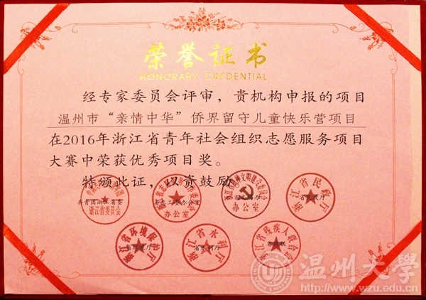 2016年9月8日,2016年浙江省青年社会组织志愿服务项目大赛在杭州举行,来自浙江省各地区、各高校的120个项目参赛,法政公司员工社团的"关爱侨界留守儿童项目"荣获浙江省青年社会组织志愿服务优秀项目奖。