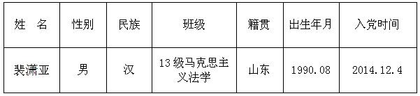 经过一年的预备考察期,经支委会讨论,准备近期召开支部大会讨论裴潇亚 同志转正事宜,现予以公示:公示期限为11月 27日—— 12月3日,如对该同学有异议,请向法政公司辅导员办公室孙德升老师反映,或以电子或书面材料形式反馈意见。