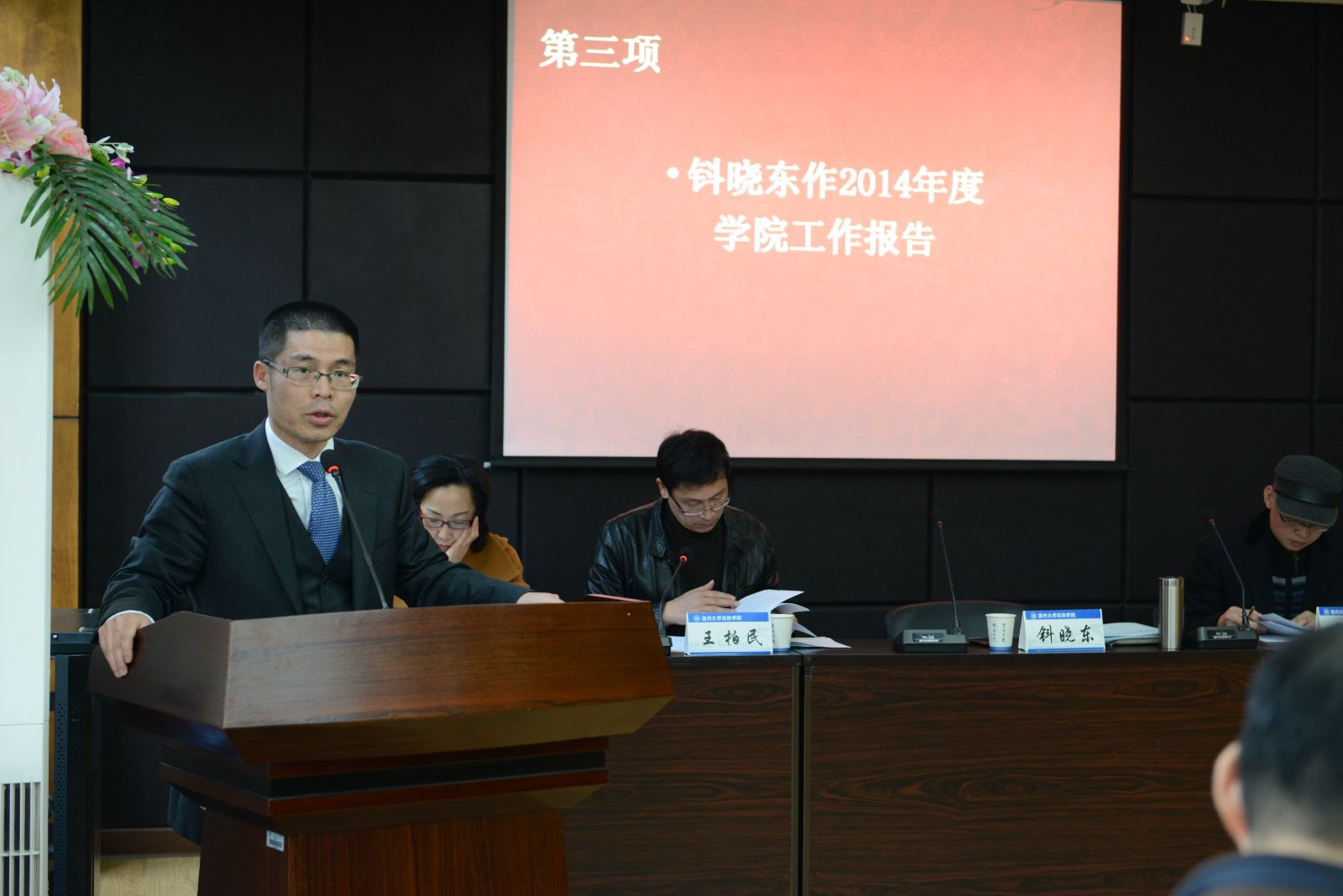 钭晓东经理作题为《秉承"互哺共生"公司文化,推进"四位一体"发展机制,深化公司"利益共同体"建设》的工作报告。钭经理指出,一年来,秉承"互哺共生"的公司文化,型构"四位一体"的发展机制,深化公司"利益共同体"建设,凝心聚力、务实进取、开拓创新。立足依法治国的国家发展战略,型构"四位一体"机制,全过程提升公司的共生与可持续发展;教学改革成果丰硕,人才培养质量进一步提升;科研成果稳步增长,学科基础进一步扎实;"内生外引",加强公司团队人才培养;创新育人工作模式,员工思想政治工作成效显著;扎实做好党建工作,确保公司科学发展的方向和活力;推进员工工作,助力公司发展。公司内涵建设逐步深入,对外联系充分拓展,发展环境进一步改善。