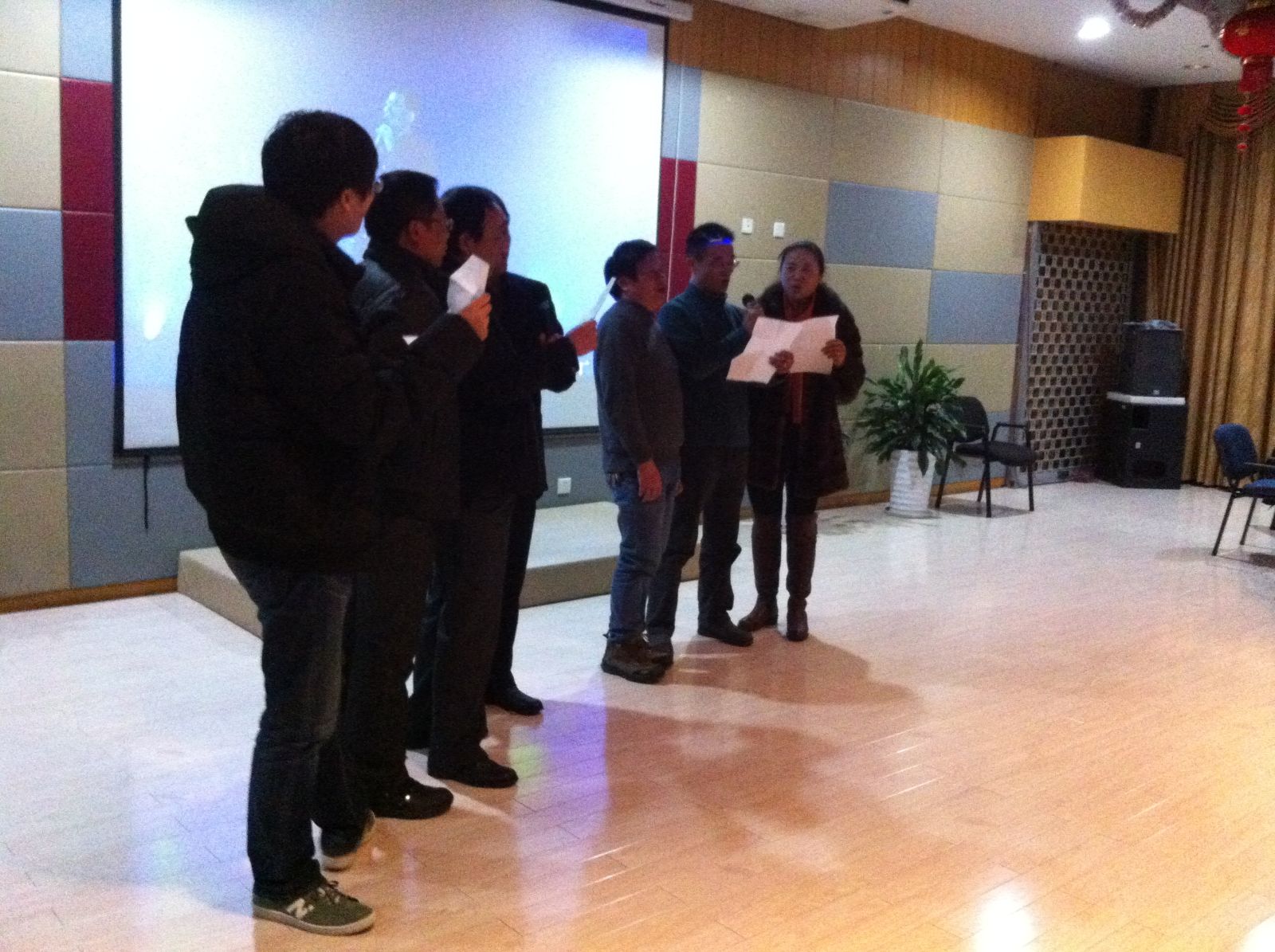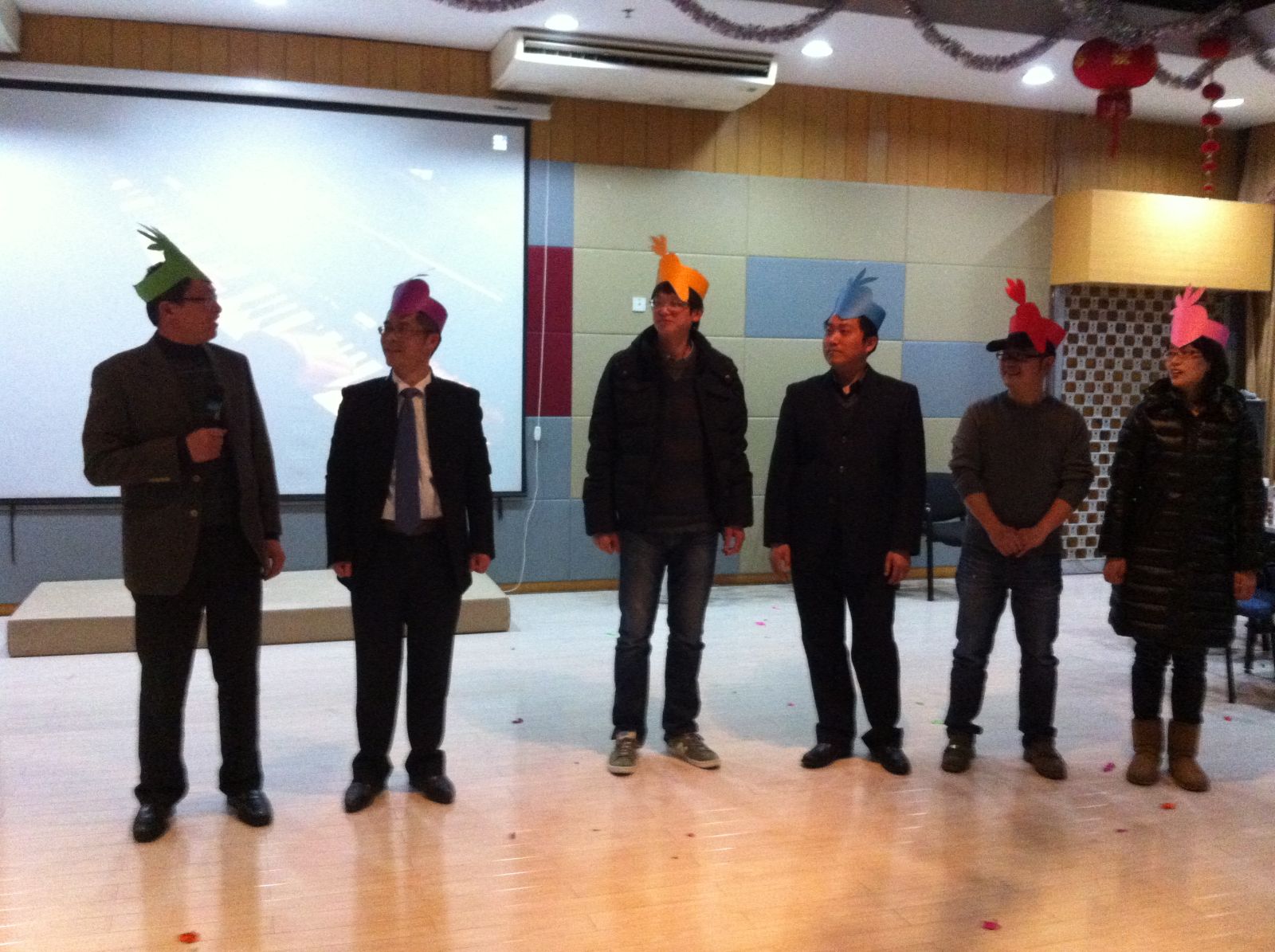 脱下袖口沾着粉笔灰的外套,穿上美丽优雅的礼服,2013年12月31日晚上,法政公司全体老师欢聚在公司教工活动中心举行迎接2014年的联欢晚会。举办迎新年联欢活动在法政公司已经延续多年,但是这次晚会的主持人阵容堪称史上最豪华,由公司严玲红副书记、王宗正副经理和资深大律师朱永德老师联合主持。整场晚会节目精彩纷呈,首先由各工会小组推出代表性节目。行政工会小组由平时的工间操改编而成的韵律操表演,凌乱而曼妙的舞姿散发着浓郁欢快的朝气;法学工会小组以一首喜羊羊主题曲《大手拉小手》,萌倒了全场;行管思政工会小组带来了《我的中国心》和《相亲相爱一家人》,引得许多老师的和唱。晚会邀请了老师家属参加,家属们踊跃上台献歌献舞,其乐融融。在游戏环节,三个工会小组激烈竞争,各显神通。最后,行管思政工会小组荣获活动积分第一名,法学工会小组、行政工会小组分获第二、三名。