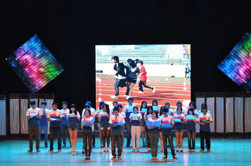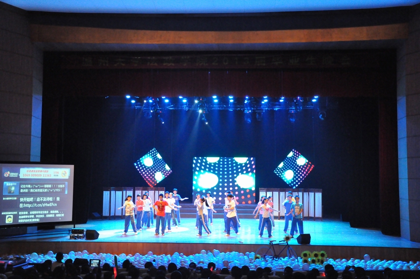 晚会正式开始后,一个个精心编排的节目赢得了在场师生阵阵雷鸣般的掌声与尖叫声,现场不断升温。他们的心随音乐跃动,青春的力量无法抗拒,即便是要说再见的日子。老师和员工们的互动更使得现场笑声接连不断,微博互动墙也在及时更新,分发传递着同学们的感动、感恩、祝福与快乐。将近三个小时的晚会就要接近接近尾声了,数盏纸飞机飞旋而下,带走了时光却带不走回忆。晚会在一首淡淡感伤的歌曲——《同桌的你》中圆满落幕了,全体毕业生和老师在舞台上合影留念,他们的笑定格在这个明媚的五月。