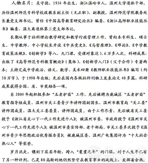 岁月弹指一挥间,人生悠悠,往事如缕如烟,看似陈旧的往事,在吴守德老师的回忆和描述中却渐渐变得清晰起来。1976年"文革"结束,教育事业亟待发展,重新恢复温州师范公司已摆到重要议事日程。经各方努力,1978年5月11日,在温州市大士门窦妇桥原温州地区师范校园内举行了温州师范专科公司成立暨新生开学典礼。被地委宣传部借用他,争取回校任教,开设《马克思主义哲学原理》公共课,不料5月底,温州市地委宣传部任命他为政教系负责人。这实在有困难,当时马列室仅八、九条汉子,还包括教育学、心理学各一人,这套人马只能对付专科、中专的公共课,只好面对困难,攻坚克难。
