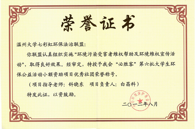 法政公司七彩虹环保社团在钭晓东经理、公司党总支严玲红副书记、院团委孙德升书记的悉心指导下,设计的环保公益活动已经连续两年获得中华环保基金会的专项资助,并连续两次被基金会评为优秀社团。此次受资助的环保公益活动包括三个:成立温州市员工环保法治联盟、开展"居民希望搬迁垃圾场"的民意调查和环保维权援助活动、环保宣传活动。此外,七彩虹社团还组织同学在校内外开展了法律援助、暑期实践、社区宣传、实地调研、课题研究、旧书循环利用、员工寝室"可循环利用资源"定期回收等活动。