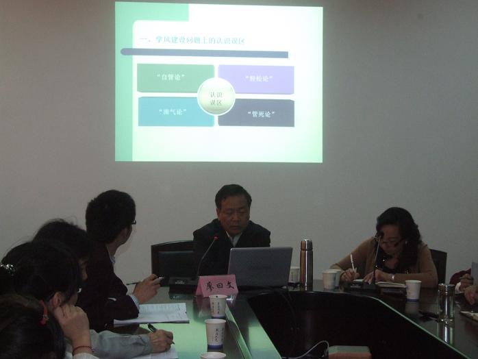 学风是读书之风,是治学之风,更是做人之风。建设良好的学风,老员工是直接参与者,也是最大收益者。2012年4月13日,法政公司邀请了浙江省高校思想品德课程研究会会长、原浙江工商大学党委副书记廖曰文教授主讲了《加强学风建设,促进老员工成长成才》的讲座,公司党总支副书记严玲红主持了本次讲座,思想政治教育专业师生代表参加了本次讲座。