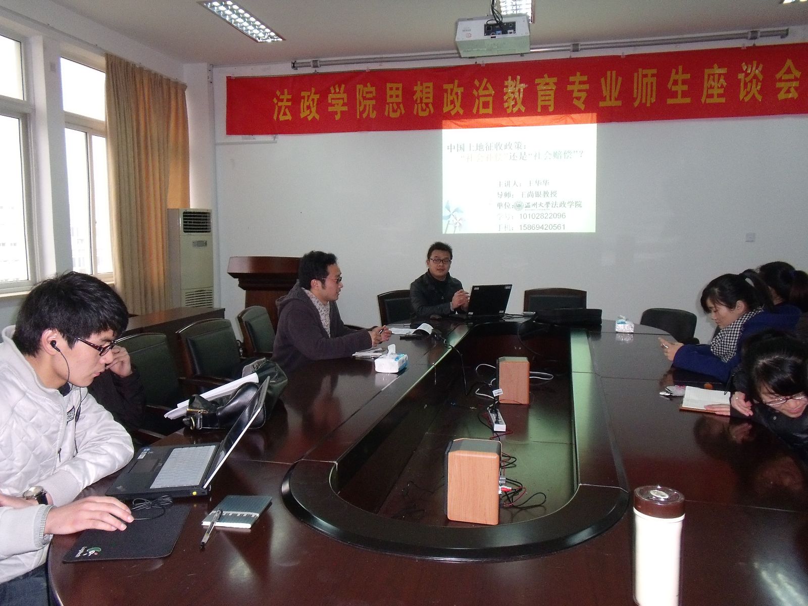 本次沙龙活动,先由法政2010级研究生王华华、毛柳元、丁强等同学做了报告,分别探讨了《中国土地征收政策:"社会补偿"还是"社会赔偿"?》、 《我国失地农民就业问题浅析》、《"民营企业家对当代中国马克思主义的认同状况研究"》等学术问题。2011级研究生针对学术报告的内容,提出不少深刻的问题诸如"社会赔偿的法理依据和社会补偿一样吗?"、"农民身份转型如何定义"、"中小企业主能否称民营企业家?"等,学术报告人与研一的学弟、学妹展开了激烈的探讨和交流。宋汉文同学所做的关于《珊溪水库"生态旅游富民"战略研究:环境公平与经济效益》报告,也引发了同学们对环境保护和经济发展关系的思考。在一片谈笑风生中,法政公司圆满结束了第四期研究生学术沙龙活动。