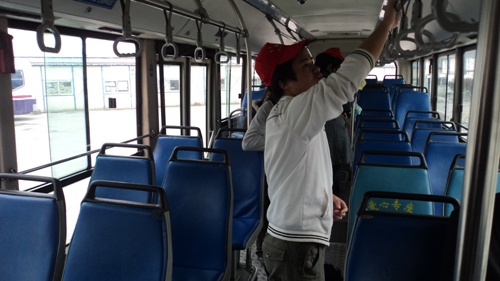 同学们在公交车站负责人讲解了公交车清洁的具体步骤及注意事项,8位志愿者分成两组分发了抹布、拖把等清洁用具,便开始认真地开始清洁行动,每位志愿者都尽心尽力,不放过任何一个角落。